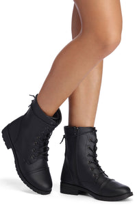 Step up and take charge in style like a boss in these black boots! They feature a mid calf fit, a lace up front, round toe, an inner zipper closure and a low stacked heel with textured sole. Boots are composed of a faux leather material.