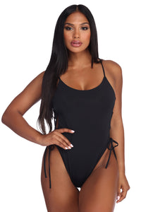 Lace up in this sexy black swimsuit to showcase curves! It features a scoop neckline, narrow shoulder straps, side lattice detailing and a high cut with cheeky coverage.