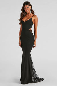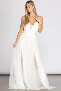 Waltz your way in and make a magical entrance with our stunning Maxine formal dress! She features adjustable spaghetti straps that lead to a cross back design, a padded bust with subtle pleated detailing, a V neckline with a sheer lace inset at the center, and a back zipper and hook and eye closure. Her high waist flows to a floor-length tulle skirt with a pretty A-line silhouette. The sheer tulle fabric has a stretchy knit lining. Complete your gorgeous look with a sleek clutch.