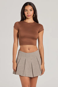 Made of sugar and spice, this plaid linen skort charms everywhere you go! The linen-blend fabric showcases a small plaid pattern for an adorable classic vibe. Featuring a high-rise waist and pleated skater silhouette, this mini-length skort offers both comfort and cuteness. Style with a basic crop top.