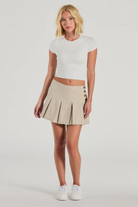 Show off your most adorable style in this pleated mini skirt perfect for weekly styling! Features a mid-rise waist with side button closures, creating a flattering A-line silhouette with a pleated mini-length hem. Complete the look in a cute short sleeve top.