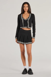 Bring the preppy charm in this pleated knit mini skirt featuring a flattering mid-rise waist perfect for styling with a cropped cardigan.