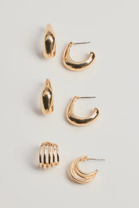 This sleek three-pack earring set features two small pairs of asymmetric hoop earrings and one small pair of curved hoop earrings with a chic bar design. Style with a dainty necklace for everyday glamour!