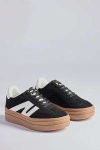 A pair of faux suede sneakers feature a round toe, rubber gum platform sole that elevates the look, a lace-up front, and a side striped design. Perfect for everyday styling.
