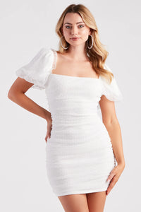 Bring those flirty vibes with a stunning mini dress that makes the perfect first impression! The dress features a square neckline, short puff sleeves, a swiss dot pattern throughout, a ruched body, and a mini-length silhouette. The dress is composed of a lined mesh fabric that offers a form-hugging fit with a moderate stretch. Complete look with mules and gold earrings.