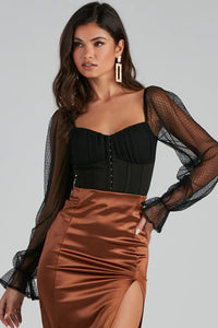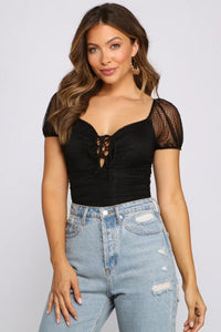 Show off your sweet side with this pretty bodysuit that brings charming details! The bodysuit features a sweetheart neckline, a lace-up front, short puff sleeves with a polka dot pattern, and a contrast bottom. Complete look with high waist shorts.