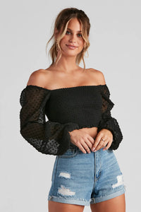 Stay on trend with a cute top that is perf for nailing those brunch outings with the squad! The top features a pretty swiss dot pattern, a square neckline, a smocked bodice, sheer long bishop sleeves, and a cropped hem. The top offers a form-hugging fit with a moderate stretch. Complete look with mom jeans and mules.
