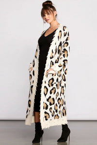 Layer on this stylishly spotted leopard print duster to get a trendy chic look! It features a long flowy fit with a cool distressed hem. Pair over a midi sweater dress for an adorable look.