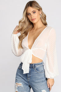 Get that boho-chic vibe going in this adorable tie-front top! It features long blouson sleeves, a deep V neckline, a tie detail that can be tied in the front or the back, and a cropped, form-hugging fit. Complete your outfit with printed flare pants and strappy sandals.