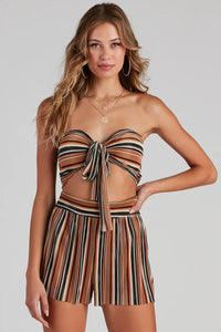 Keep it trendy with a tube top that is all the rage! The top features a trendy striped pattern, a sleeveless sweetheart neckline, and surplice ties that can be used to create a halter neck or tie front. Complete the look with the matching shorts.