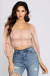 Stay sassy and stun in this gorgeous sweetheart mesh crop top! It features long sheer mesh sleeves with dot detailing and a ruched lined mesh bodice with a cropped hem. Pair with a mini skirt for your new fave date night look.