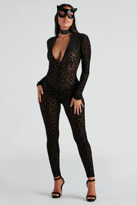 Sexy Leopard Mesh Catsuit Sexy Leopard Mesh CatsuitLet your inner fierce feline out to play this Halloween! Create a sexy DIY costume with this leopard mesh catsuit featuring long sleeves, a mock neck, front zipper closure, and a skinny-leg design. Complete your costume with simple black heels and undergarments recommended, and a mask for the party! Fit & Features - Long fitted sleeves, mock neck