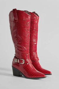 Desert Sun Western Buckle Under-The-Knee Boots Desert Sun Western Buckle Under-The-Knee BootsThese faux leather boots feature a western-inspired buckle and an under-the-knee length perfect for styling with your favorite denim. Fit & Features - 2.5" Block Heel