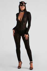 Fierce Flair Leopard Print Sheer Mesh Catsuit Fierce Flair Leopard Print Sheer Mesh CatsuitBring a fierce flair to your night-out look in this sheer mesh catsuit! It features a mock neckline, a zip-front design, long fitted sleeves, fitted pant legs, a form-hugging silhouette, and an all-over flocked velvet leopard print pattern for a sassy vibe. The sheer mesh fabric has a moderate stretch. Style this catsuit with rhinestone hoops and strappy stilettos for a sultry vibe! Fit & Features - Mock neckline, zip-front