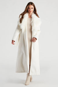 Make it a formal affair with a coat that brings that extra touch to your dressy outfits. The coat features a collared neckline, a removable faux fur collar, long sleeves, a tie-waist belt, and a long length with a center-high slit at the back. The long coat is composed of a lined faux wool fabric that offers a relaxed fit. Complete look with thigh-high boots
