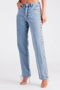 Serve iconic glam looks in these trendy rhinestone lace-up jeans! They feature a high-rise waist, rhinestone-embellished lace-up sides with tie closures at the hems, and a relaxed straight-leg silhouette. The jeans include two front and back pockets and a hidden front zipper and button closure. The medium-wash denim fabric has a rigid fit with no stretch. Style with a basic crop top and clear mules.