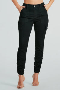 Create an effortless vibe in this denim skinny jeans! Featuring a flattering high-rise waist, front pockets lower flap cargo pockets, and unique side ruched hem seams, these jeans combine style and function. Made with premium denim fabric for a comfortable fit that holds its shape and offers a slight stretch. Style with a smooth knit tee for casual plans!