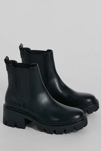 These faux leather lug booties will up your fashion game with their high style! They feature a round toe, sturdy lug sole, and short block heel offering a mix of function and fashion with elasticized side inserts for easy on-and-off styling. Complete the look in a sleek moto jacket.