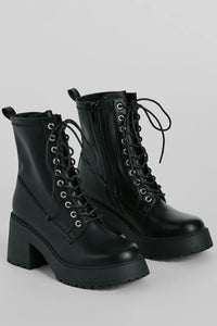You'll be looking tough girl chic all season in these faux leather combat booties perfect for adventures downtown or concerts! These boots are designed with a round toe and lace-up placket for a classic combat style and a platform lug sole and block heel provide both style and stability, making these boots perfect for all-day wear. Elevate your style game with these fierce and functional booties by pairing them with an edgy crop jacket.