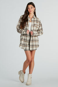 Paint the town in this plaid flannel shacket essential for chilly days and looking trendy! The shacket features long sleeves with snap-button cuffs, a collar neckline, snap-button down closures, flap pockets, and a relaxed silhouette. Style with the matching skirt for the perf complete look!