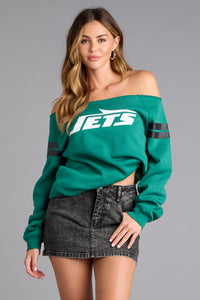 Game day just got a glam upgrade. This New York Jets off-the-shoulder top brings cozy vibes with a flirty twist, finished with bold graphics that score every time.