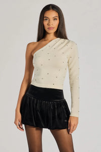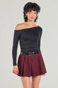 You'll be looking simply flawless in this smooth knit off-the-shoulder top. It features an asymmetric off-the-shoulder neckline with pleated detailing, long fitted sleeves, ruching down the side seams, a mid-length hem, and a form-hugging fit. The double-lined smooth knit fabric offers a seamless look with plenty of stretch. Style with cargo pants and mules!
