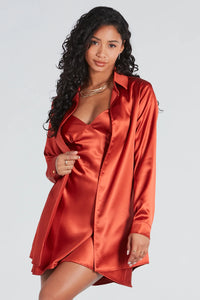 It'll start out as just a crush, but you'll totally be smitten with this top and shorts set for all of your styling needs! The top features long sleeves, a collar neckline, a button-down front, and a flowy cropped hem. The shorts feature a high-rise elastic waist and a short-length hem. Each is composed of a satin pleated fabric. Complete the look in chic clear heels.