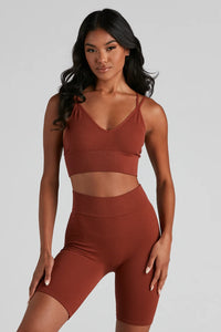 Have yourself the perfect chill sesh in this seamless bralette featuring a sleeveless V-neck, dual spaghetti straps, and a partial open-back, on a soft and comfortable ribbed knit fabric. Complete the look in the matching shorts.