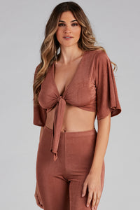 Create a flirty vibe in this flowy 3/4 sleeve crop top featuring a plunge v-neck with a tie-front on slinky knit fabric. Complete the look in the matching bottoms.
