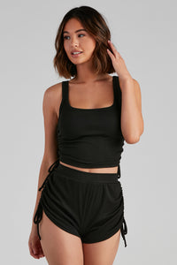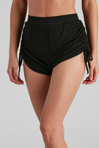 Keep it stylishly sleek with a pair of shorts that bring the luxe. The shorts feature a high-rise elastic waist, drawstring, hidden side pockets, and a cheeky bottom. The shorts are composed of a satin fabric that offers a relaxed fit with minimal stretch. Complete the look with the matching long sleeve top.