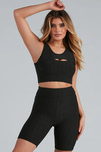 Break a sweat in style! This active sports bra features a scoop neck, front cut out, and removable padding for support and shaping, an elasticized hem, and a racerback with a keyhole cutout. Composed of a textured, moisture wick fabric to keep you dry and comfortable. Style with the matching shorts.