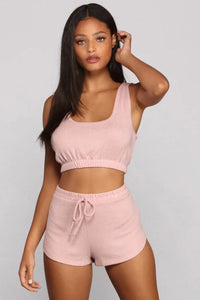 Keep it cute and cozy with pajama shorts that are oh so comfy to lounge in. The shorts feature an elastic high rise waist, a drawstring, and a cheeky fit, The shorts are composed of a brushed knit fabric that offers a relaxed fit with a moderate stretch. Complete look with the matching tank and slides.