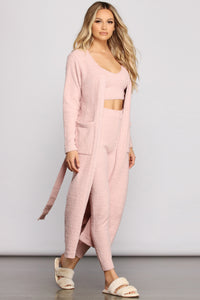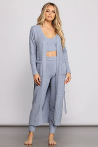 Keep it dreamy in a cozy robe for those days spent in. Layer up in this robe that features a draped open front, long sleeves, a tie waist belt, side pockets, and a long length. Complete your look with the matching pajama tank and pajama leggings.