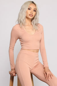 Keep it cozy and chic in a pajama crop top that is perfect for lounging in. The top features a plunging V-neckline, long sleeves, and a cropped hem. The top is composed of a ribbed knit fabric that offers a form hugging fit. Complete look with the matching pajama leggings and fuzzy slides.