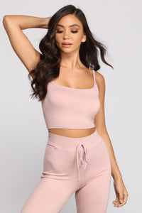 Keep it chill and cozy in a tank that is perfect for lounging at home in. The tank features a sleeveless scoop neckline, sleek spaghetti straps, and a cropped hem. Complete your look with the matching leggings and cozy slides.