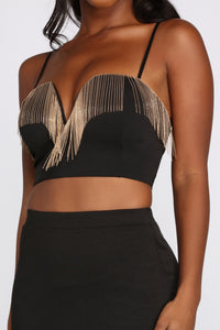 Okay babe, you sure know how to make an entrance! This head turning fringe crop top pairs perfectly with the matching mini skirt.