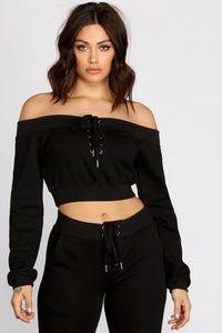 Lace up into this adorable off the shoulder crop top! Pair with the matching joggers for a trendy, totally comfy look.