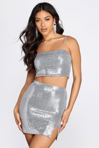 Stand out and be the star of your glam girl squad in this sequin mini skirt! Complete your look with the matching crop top.