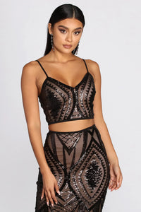 Dazzle into the new year with this sequin adorned crop top! Pair with the matching midi skirt to make a stylish statement at the stroke of midnight.