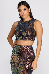 You'll create a simply stunning look in this iridescent sequined crop top! Pair with the matching midi skirt for a glamorous 'fit!