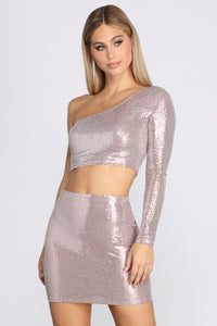 Add a little glitz and shimmer to your party look with this luxe crop top! Pair with the matching mini skirt for a beyond gorg look.