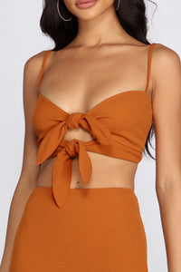 You have a high style standard, and this cute cami is perfect for you. It features a sleeveless bodice, adjustable spaghetti straps, a square back, and two tie front accents with a cropped hem. The top is composed of a knit fabric with moderate stretch. Complete your look with the matching mini skirt!