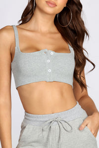 You're a cutie who totally has a casual vibe when it comes to style! This adorable crop top features a sleeveless bodice, thicker spaghetti straps, a square neck and back, a faux button down front, and a majorly cropped hem. The french terry knit fabric offers moderate stretch. Don't forget to purchase the matching joggers!