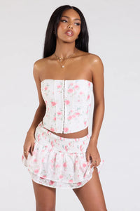 Get ready for everyone to call you cute in this floral corset top designed with a flirty lace-up back that captures attention and a cropped hem that lets you flaunt your figure. Pair with the matching bottoms.