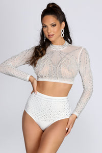 Keep it pretty in pearls with this radiating top! It features a mock neck, unlined fitted long sleeves and a cropped hem. The dazzling pearls and gemstones are set in a unique geometric pattern. Top is composed of a sheer unlined mesh fabric that offers a relaxed fit with a moderate stretch. Be sure to pick up the matching briefs to complete your look! Includes a back zipper closure.Style Number/Barcode: 06001-2056