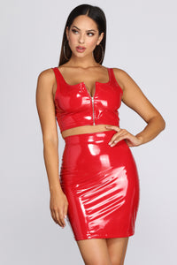Show off your naughty side this Halloween with this sizzling costume top! It features a scoop neckline, tank-like straps and a cropped hem. Top is composed of a lined faux patent leather fabric that offers a form hugging fit with a moderate stretch. Includes an exposed zipper closure that can easily be worn in the front or the back. Pick up the matching skirt and accessories to complete your sexy costume!