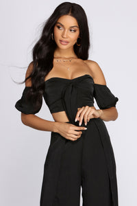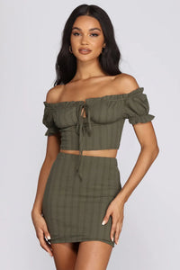 Adorable crop top that will make you an instant trendsetter? Check! This top features an off the shoulder neckline, balloon sleeves with elastic cuffs, a knot front detail, and a majorly cropped elastic banded hem. Garment is composed of a lighweight woven fabric with an all over plaid pattern. Complete your look with the matching mini skirt!Style Number/Barcode: 06003-0327