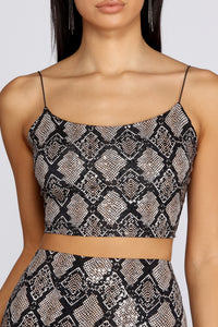 Ready to shimmy and shake when you don this snake-print crop! Top has an abbreviated silhouette and features all-over iridescent sequin embellishment and ultra-skinny contrast spaghetti straps. Top is lined at bust and made from a smooth poly blend with moderate stretch. Don't forget to pair it with the matching mini skirt!