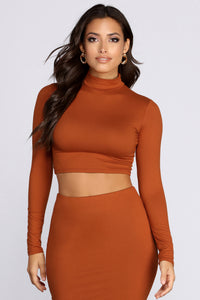 Brush up your look with basic staples that speak for themselves! This crop top features a mock neck, fitted long sleeves and a cropped hem. Top is composed of a brushed knit fabric that offers a form hugging fit with a moderate stretch. Be sure to pick up the matching skirt to complete your look girl!