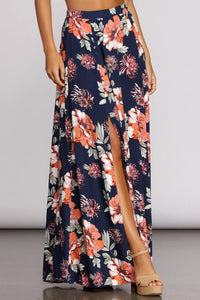 A graphic pink and orange floral set against a rich navy background makes this maxi especially eye catching. Skirt features an elasticized back waist, a partial side zip, and two front slits on either side. Be sure and grab the matching crop top to channel the perfect island vibe! Skirt is unlined and made from a lightweight woven material with little to no stretch.Style Number/Barcode: 06301-0028